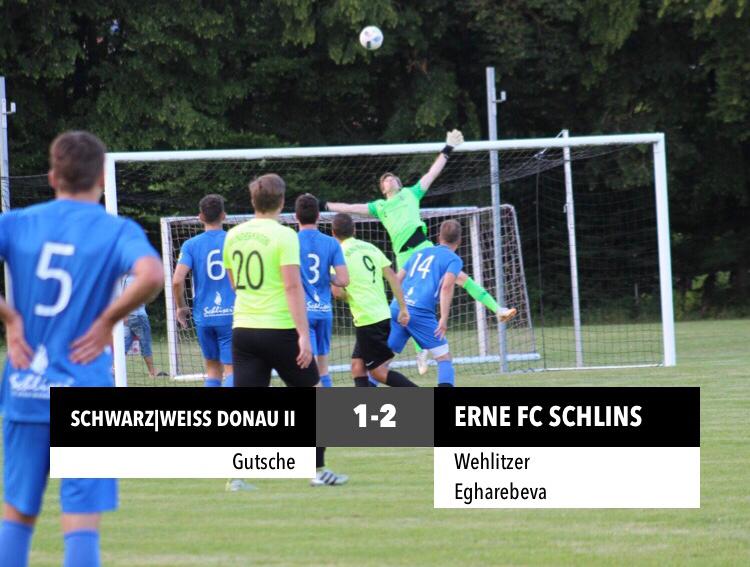 Im Anschluss, an das Spiel der ersten Mannschaft, standen die Mannen von SW Donau II den Gästen aus Schlins gegenüber. Dabei wurden einige Spieler der Gäste aus dem vorherigen Spiel nochmals eingesetzt. Das Spiel war weitestgehend ausgeglichen. Angeführt von Spielertrainer Philipp Brunner erspielten sich die Gastgeber einige Torchancen, gerieten aber Mitte des Spiels mit 0:2 in Rückstand. Viktor Gutsche konnte in der Endphase verkürzen. Quasi mit dem Schlusspfiff scheiterte Kai Breymaier mit einem Heber äußerst knapp. Schade – ein 2:2 wäre durchaus verdient gewesen.
